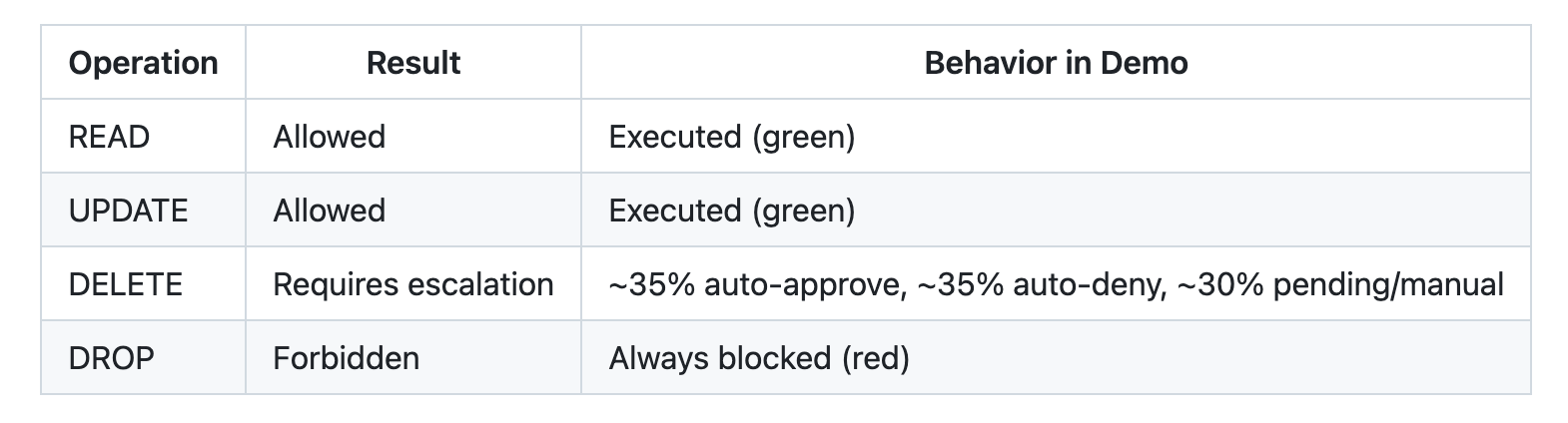 Demo note: Escalation decisions (DELETE) are probabilistic for realism — auto-approved (~35%), auto-denied (~35%), or pending (~30%) for human-in-the-loop control.